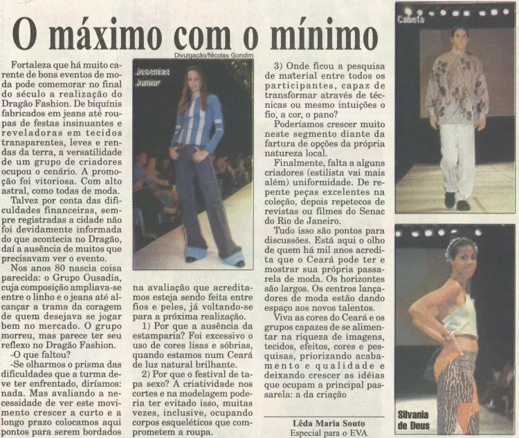 “De biquínis fabricados em jeans até roupas de festas insinuantes e reveladoras em tecidos transparentes, leves e rendas da terra, a versatilidade de um grupo de criadores ocupou o cenário. A promoção foi vitoriosa. Com alto astral, como todas de moda”. Assim era descrito um momento do Dragão Fashion Brasil no Diário do Nordeste de 5 de dezembro de 1999.