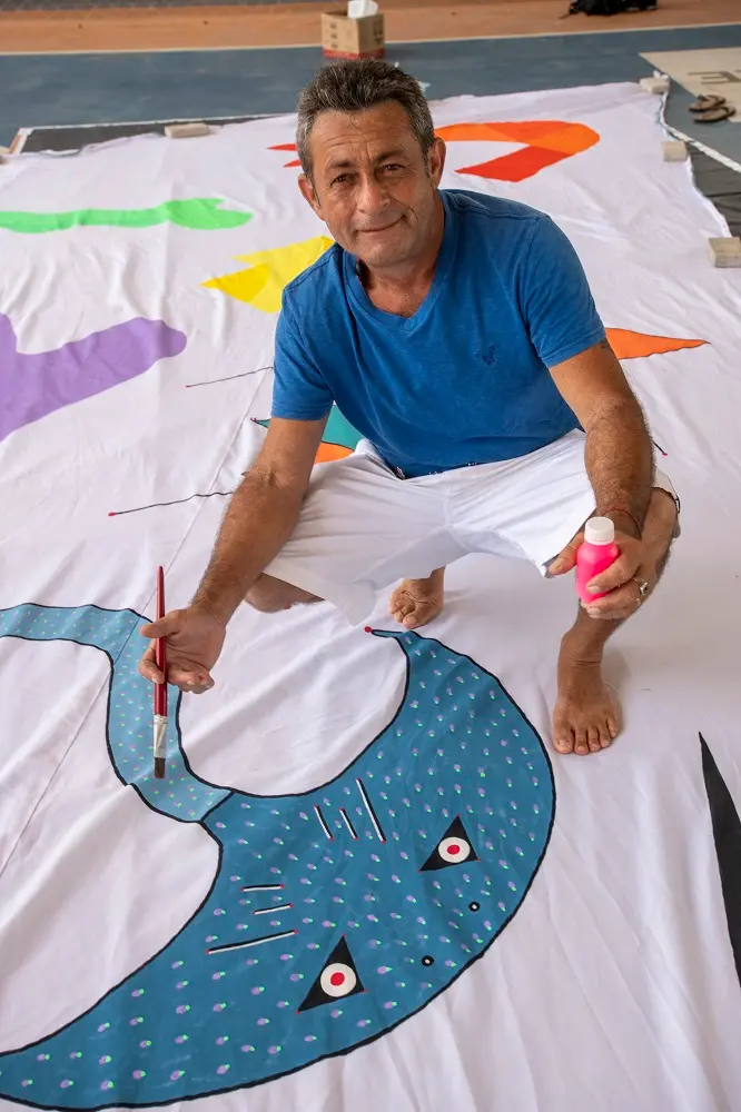 A tela confeccionada por Vando traz ilustrados sete seres marinhos, a exemplo da lagosta, da moreia e da arraia. “Todos esses personagens habitam dentro de mim”, conta o artista que, desde as primeiras edições do projeto, participa das atividades.