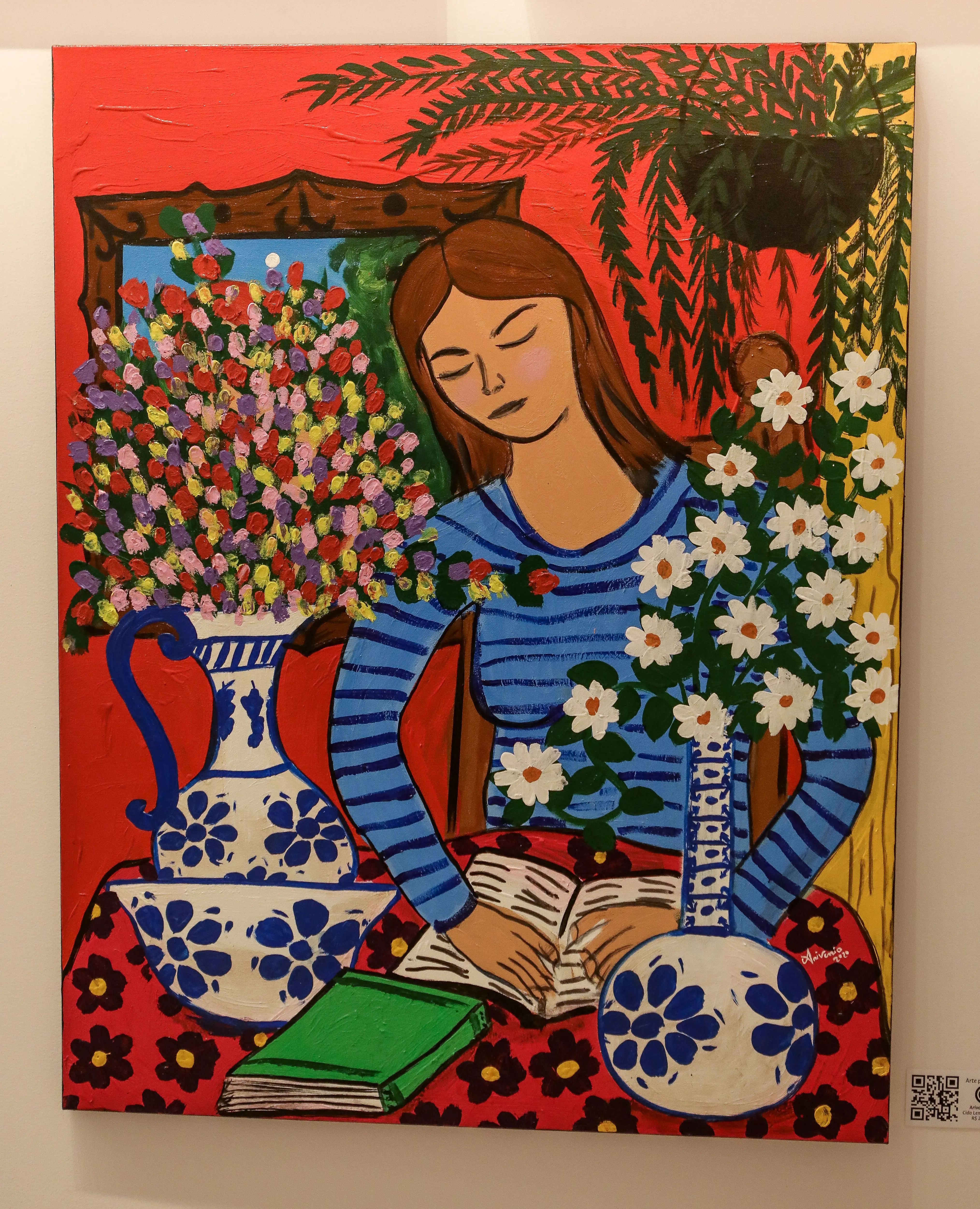 Natural do município de Quixelô, Arivanio Alves traz ‘Cida lendo II’ à mostra. A obra, segundo ele, retrata uma cena do cotidiano de uma mulher lendo livros em uma mesa de toalha estampada com muitas flores em vasos de porcelana.