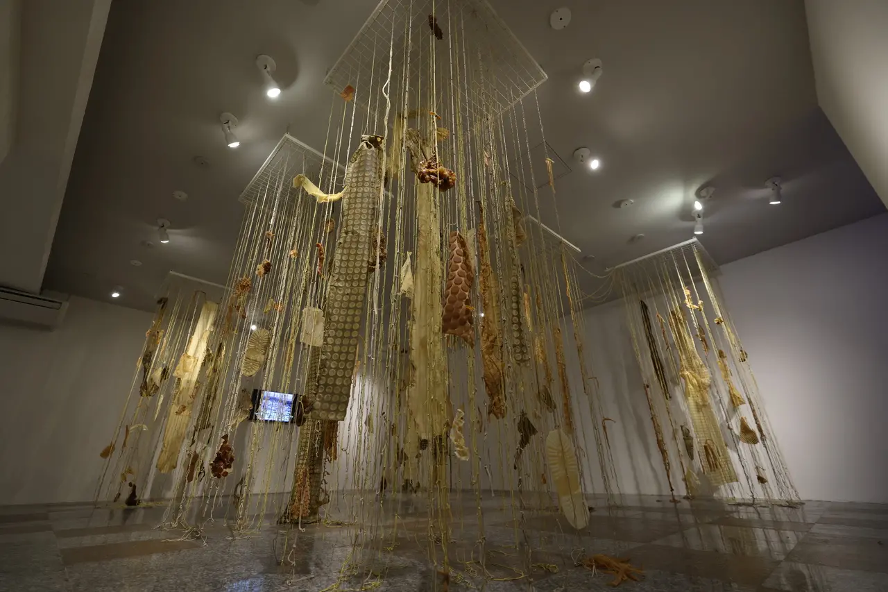 Já nas obras “Vídeo Nascente” e “Sonhário”, a artista utilizou elementos como água e terra para criar uma experiência imersiva, convidando os visitantes a refletir sobre as origens e transformações da natureza.