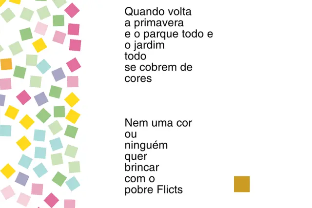 Nascia "Flicts", que, neste ano, celebra meio século em plena forma, revigorado pelo ânimo de gerações ao entrarem em contato com o livro. Texto-imagem sobre muita coisa, é universo de possibilidades abertas, num inventivo jorro cromático em direção ao profundo de nós mesmos, seja entre os de pouca ou maior idade. Afinal, conhecer a si, ao passo que atemporal, também desconhece ciclos. Ou melhor: imerge em todos eles.