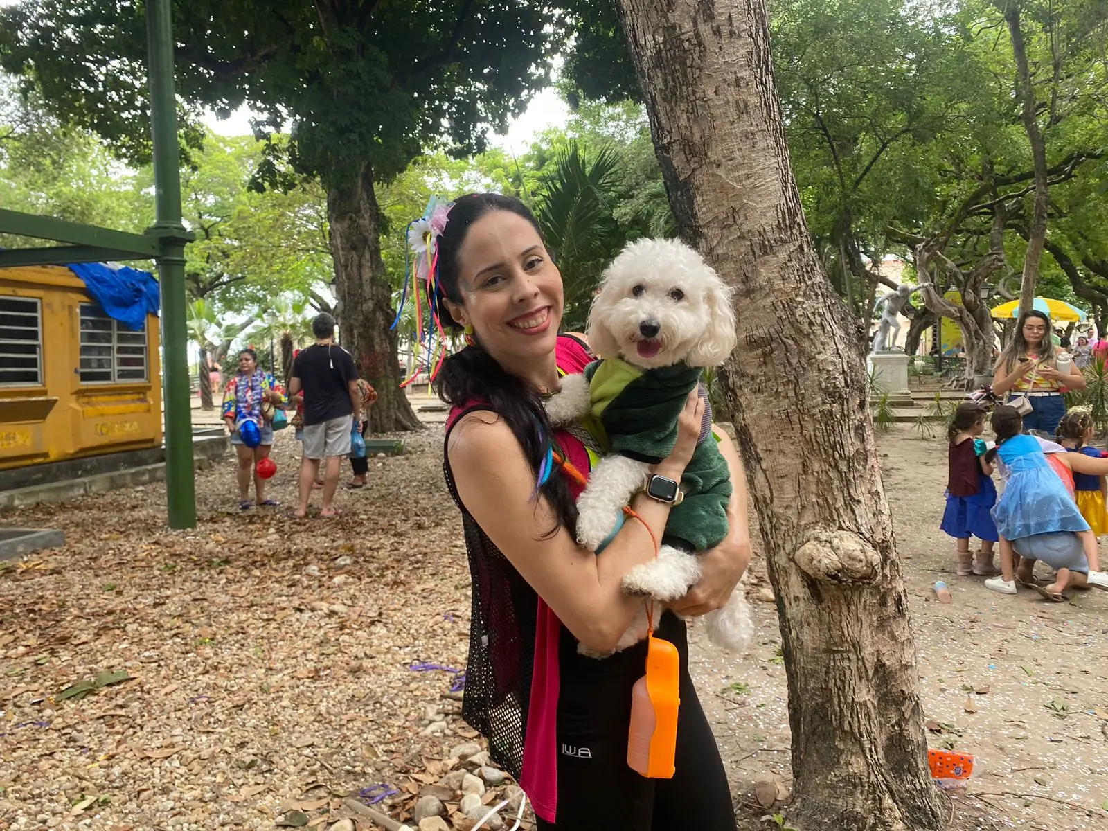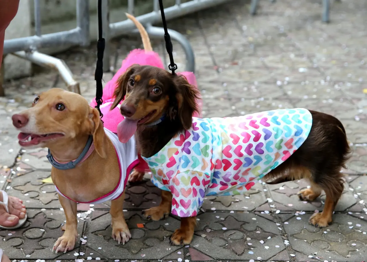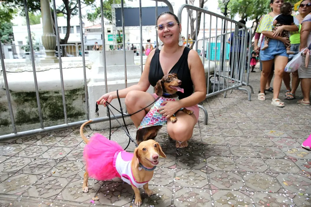 Os dois aproveitam não só o feriadão juntos com música e dança, mas até andam de bicicleta por Fortaleza, conforme a tutora. No Passeio Público, várias famílias estavam também acompanhadas dos bichinhos com roupas decoradas ou somente de coleira.