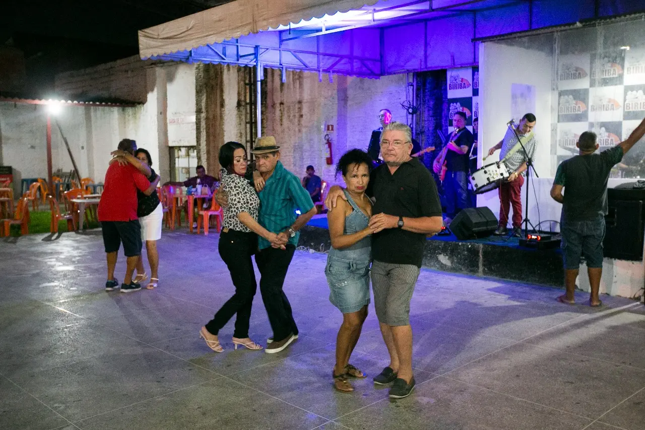Dentro do estabelecimento, mesas e cadeiras brancas de plástico enfileiravam a primeira parte do local. No meio, uma quadra de dança onde homens e mulheres revezavam seus parceiros a cada início de música. Na lateral, o bar vendia da água de coco à cachaça. Na banca, mais ao fundo, comidas típicas e churrasco feitos por Dona Rosangela da Silva, 50. Tudo a preço popular.