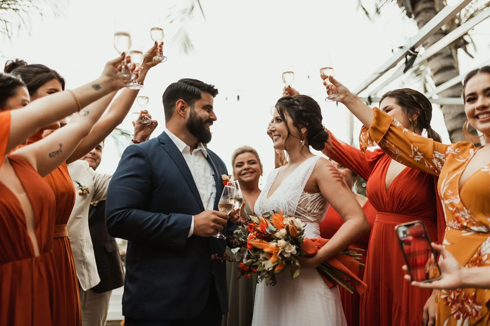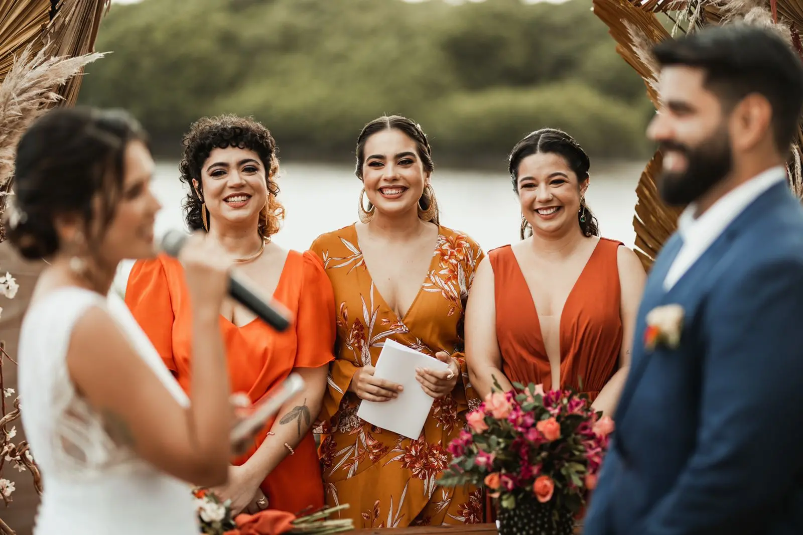 A UX-writer Érika Neves e o consultor legislativo Helder Farias também fizeram o cortejo de forma diferente na festa de casamento. "Não tivemos padrinhos, apenas madrinhas e foi muito natural, porque realmente as pessoas mais próximas do casal são essas minhas amigas, temos amigos homens, mas não faria sentido fazer parte do cortejo".