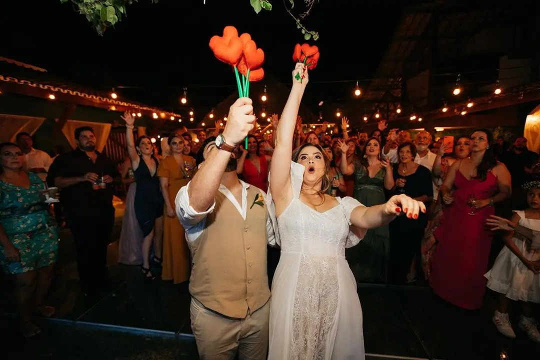 Até a famosa disputa pelo buquê ganhou outro significado na cerimônia de Deborah e Waldemar. Juntos, os dois jogaram ‘buquês de corações’ para todos os convidados. Entre os coraçõezinhos, dois tinham uma fitinha amarrada e quem os pegasse ganharia um brinde: o buquê de flores ou um uísque.