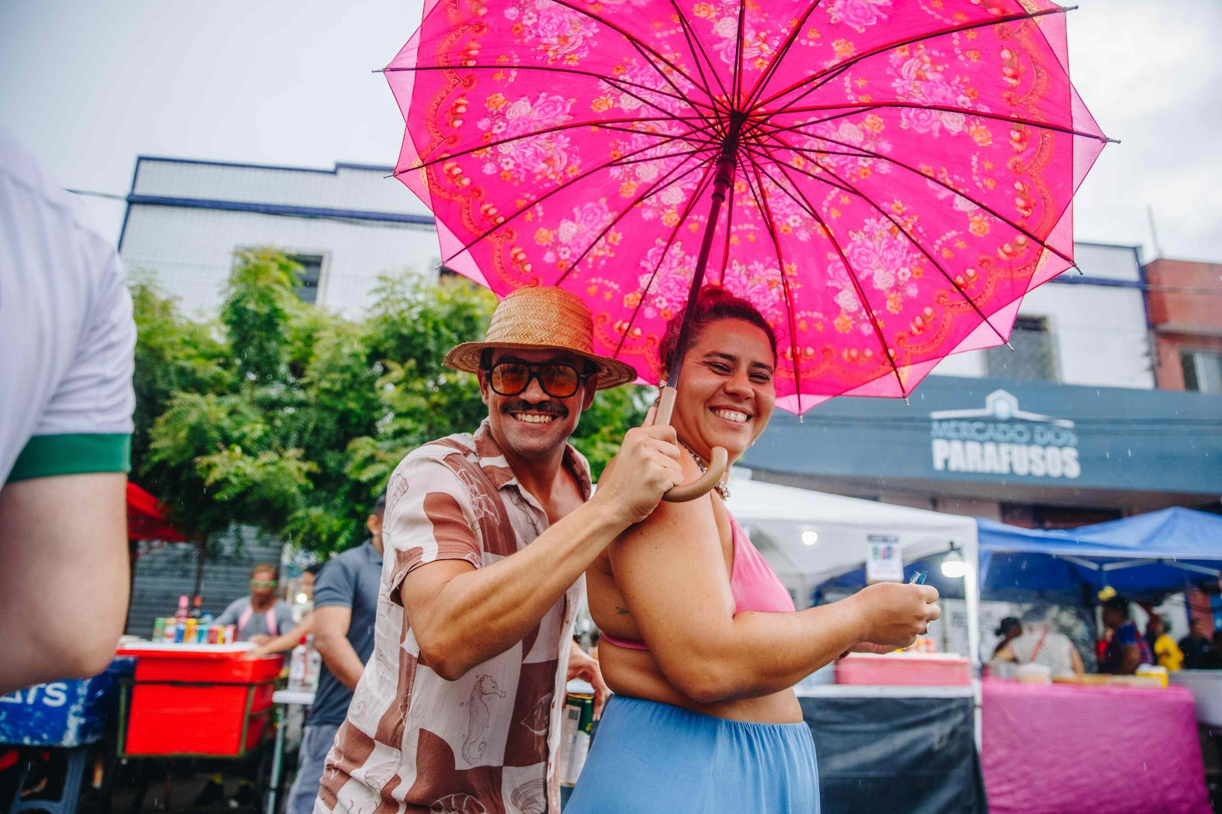 "Não tem chuva que empate, meu querido". Como se quisesse provar que sua carne é feita — sim! — de Carnaval, a microempreendedora Patrícia Vasconcelos foi curtir a festa no Mercado dos Pinhões, em Fortaleza, na tarde deste sábado (1º). O primeiro dia de festa, marcado por chuva e céu cinzento, teve um diferencial: guarda-chuvas como acessórios de carnaval.