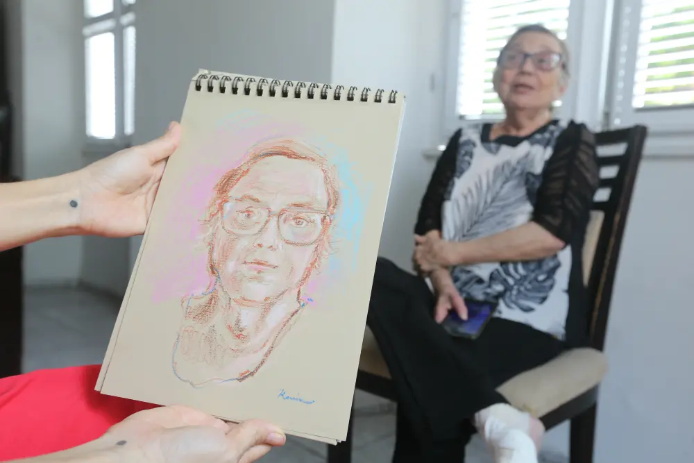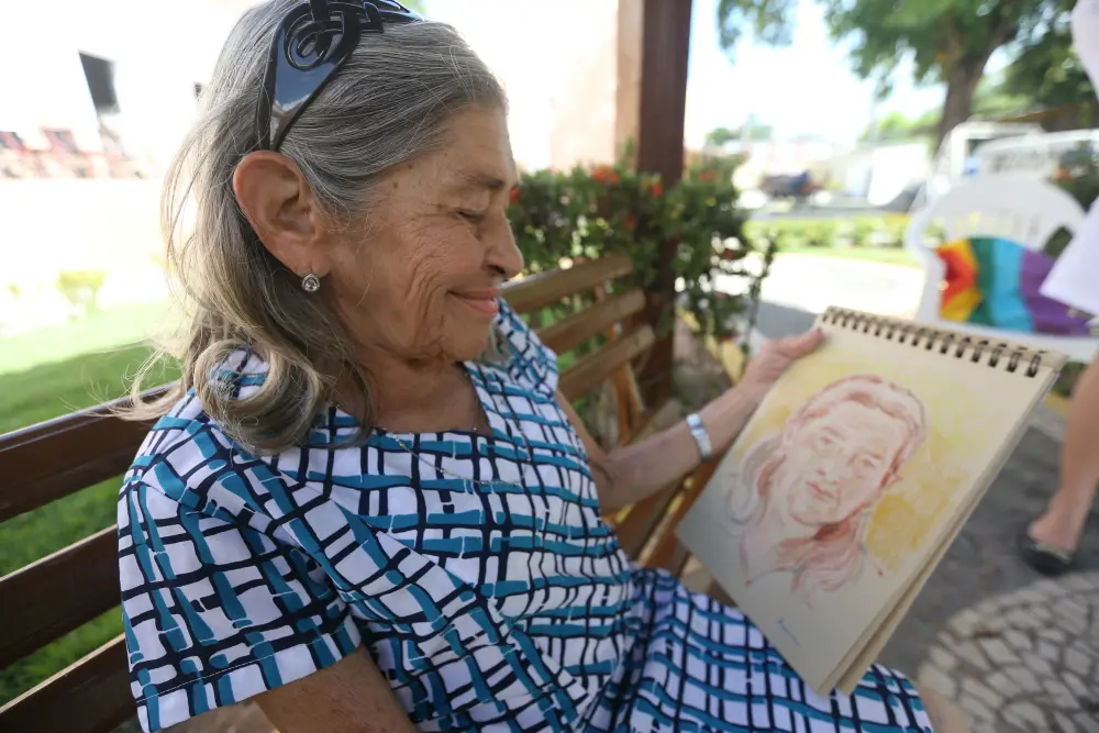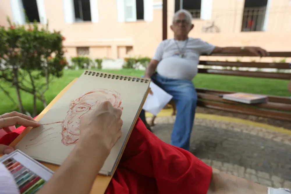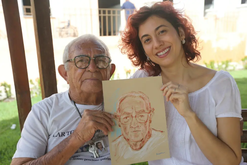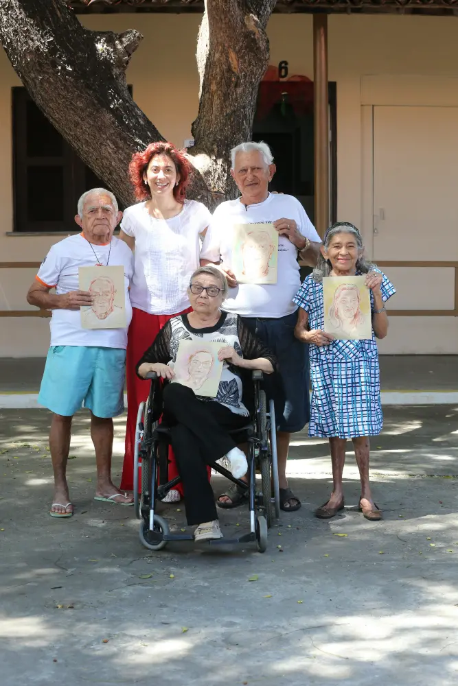 Idosos do Lar Torres de Melo contam histórias da infância enquanto são desenhados por ilustradora