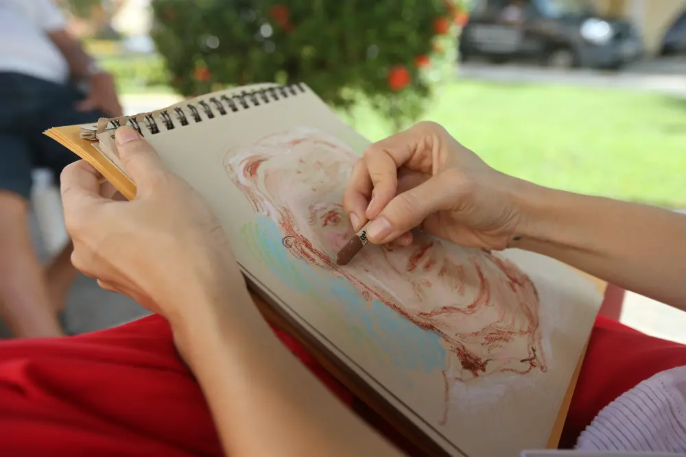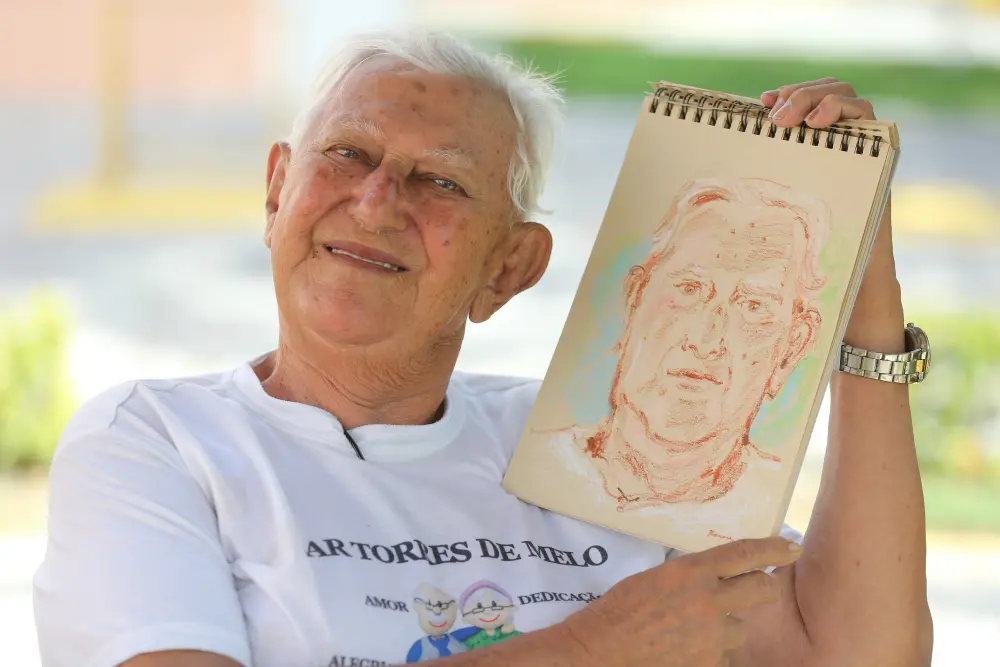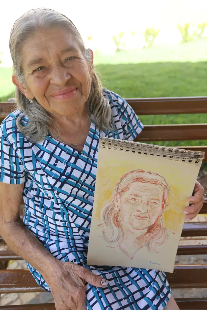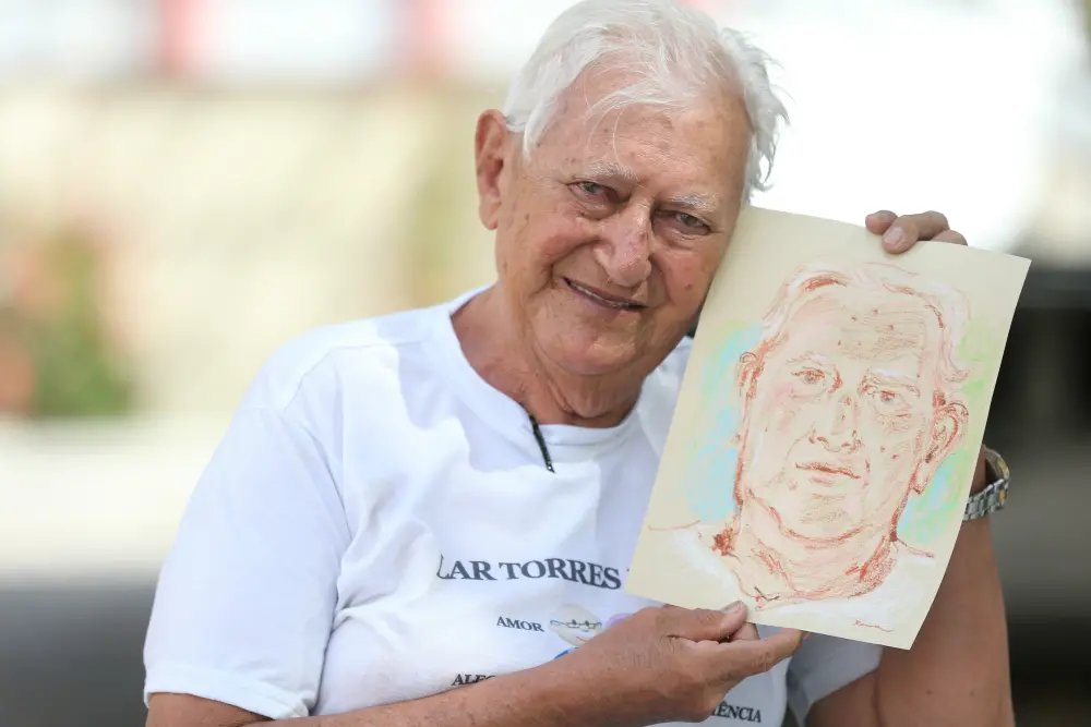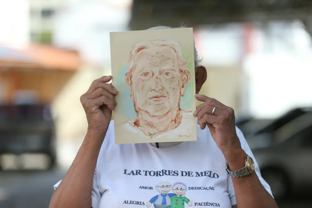 Idosos do Lar Torres de Melo contam histórias da infância enquanto são desenhados por ilustradora