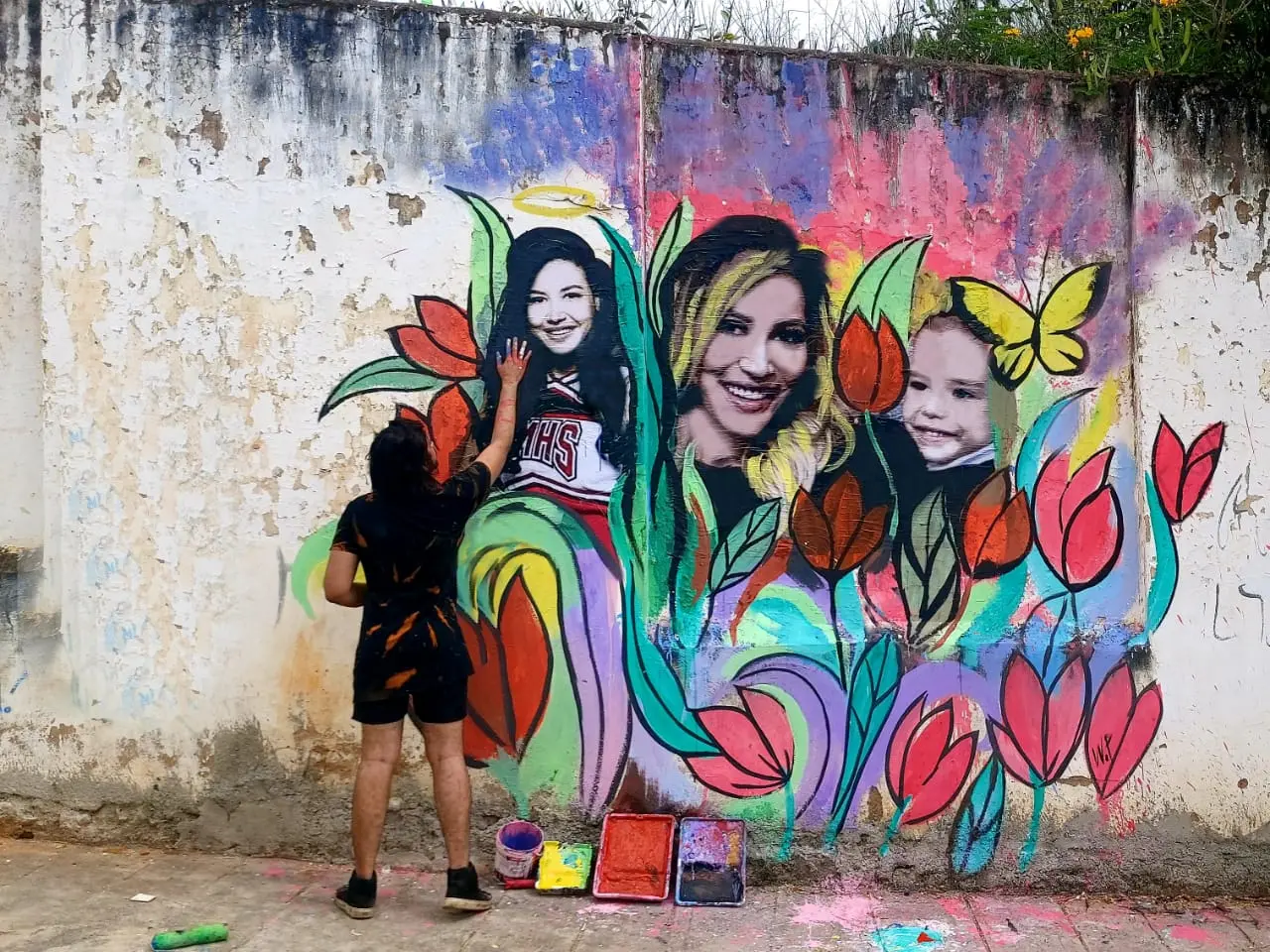 A partir de então por já ter experiência com arte de rua, escolheu um espaço para expor os sentimentos. Nas proximidades de uma avenida, entre cores e flores, sobrepôs a imagem de Naya e do filho como uma maneira de lembrar a si mesmo da importância dela. “É uma forma de imortalizar aquela pessoa, de mostrar como ela me atravessou. Também uma maneira de guardá-la ali, em um tempo, em um espaço. A arte de rua ela é efêmera, mas esses registros são documentados. É uma forma de dizer obrigado, porque a arte dela não passou despercebida”.
