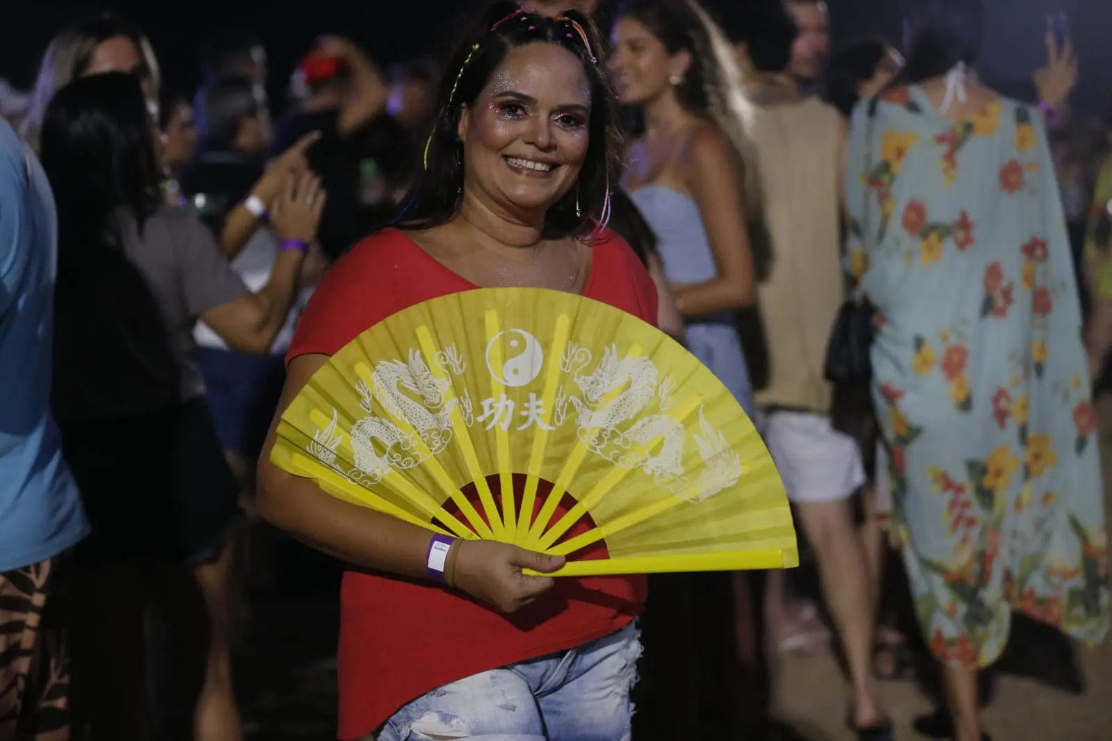 No Aterrinho da Praia de Iracema, próximo da brisa do mar, o leque também surgiu, ainda em um cenário mais fresco. Foi Talita Bezerra uma das poucas que carregou o item debaixo do braço, quase como algo essencial para se proteger na festa.