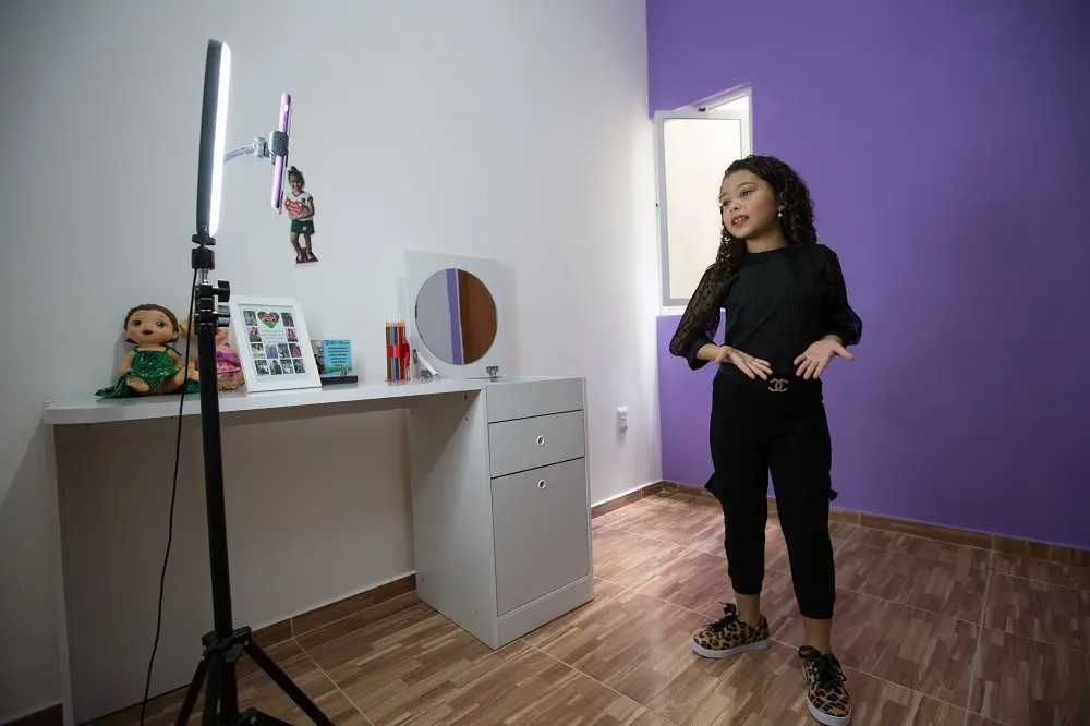 Do outro lado de Fortaleza, no bairro Planalto Mondubim, outra criança movimenta a internet mediante gravações que contemplam a dança. Valentina Santana, aos sete anos, prepara todo o quarto antes de dar o play. Afasta os objetos, limpa o ambiente, posiciona o celular no anel de luz comprado pelos familiares. Tudo pronto: agora, é mexer o esqueleto.