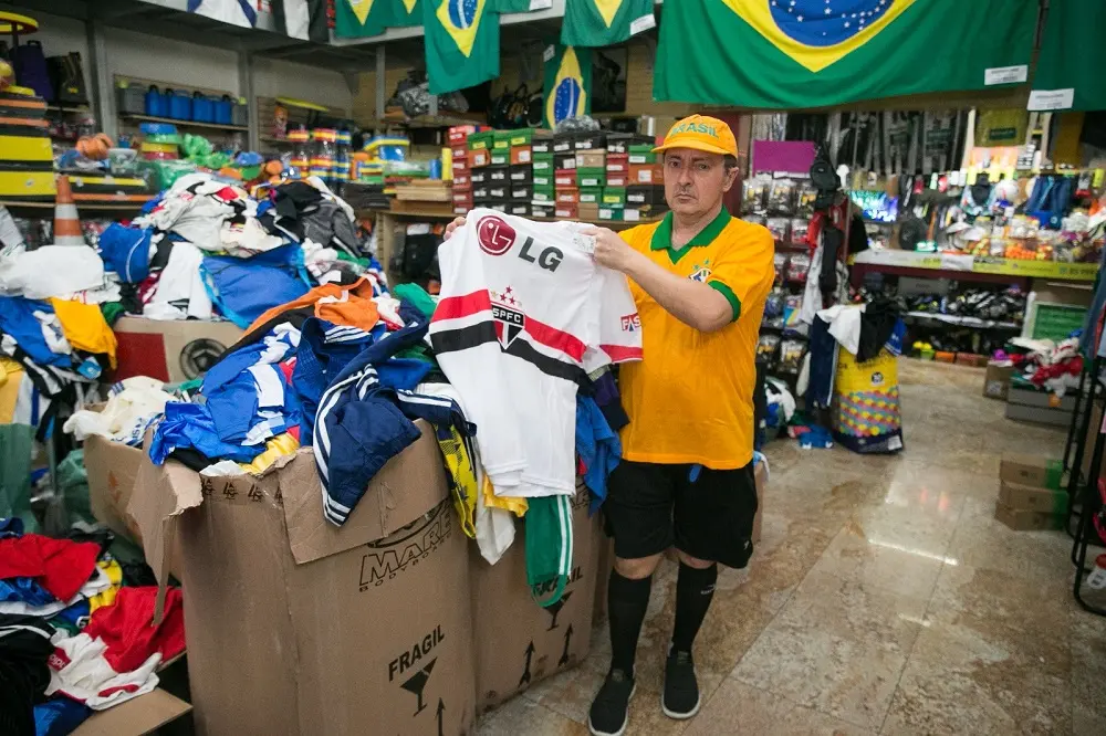 O próprio Sérgio incorpora o look ao corpo. Surge dos fundos da loja com camisa original do Santos Futebol Clube, calção, tênis esportivos e meia depois do joelho. Um jogador. Um fã. “Torço para todos os times”.