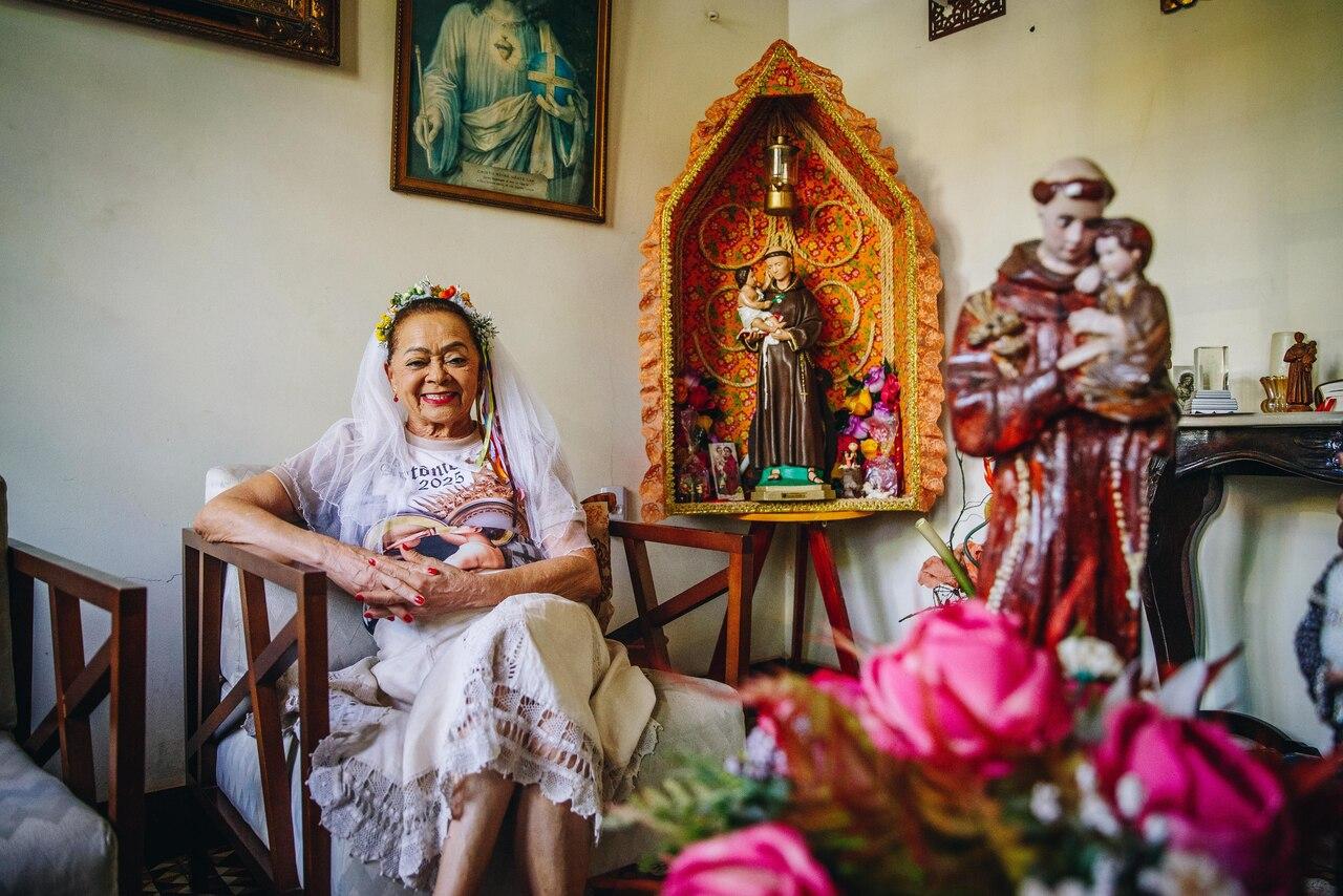 Mesmo em meio a dezenas de outras casas coloridas e enfeitadas com adereços juninos, uma residência se destaca na Rua do Vidéo, no Centro Histórico de Barbalha. É ali, numa pequena casa magenta, que fica localizado um dos mais famosos pontos turísticos da cidade, principalmente durante a Festa do Pau da Bandeira: o lar da devota Socorro Luna, 71, conhecida como “a solteirona de Santo Antônio”.