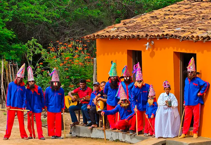 É novembro em Potengi, no Cariri cearense, e, no Sítio Sassaré, uma casa simples e de cor laranja destaca-se no meio da paisagem seca do “b-r-o bró” nordestino. De portas abertas para o sertão, o casal Antônio Luiz e Rosa abre também a caixinha pessoal de memória, de onde saem as histórias sobre o Reisado de Caretas do qual dão conta há pelo menos três décadas.