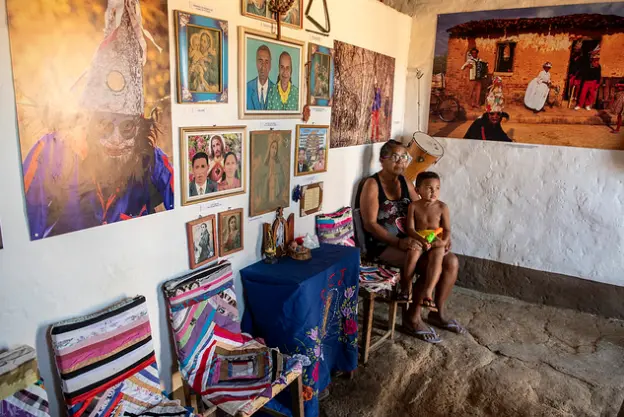 Rosa, aliás, também faz tapetes com retalhos que o esposo compra com o salário de Mestre da Cultura. Sentada sobre bancos cobertos por esses trabalhos manuais, ela observa alguns detalhes na casa que merecem reparos, tais como as paredes, cheias de altos e baixos, e o próprio chão, repleto de buracos. “Menino, eu vou mandar cavar ela todinha, aguar e bater de novo, porque eu não vou ficar com essa casa, quando tiver os buracos, como é que eu varro? Vou cavar mesmo!”, conta.