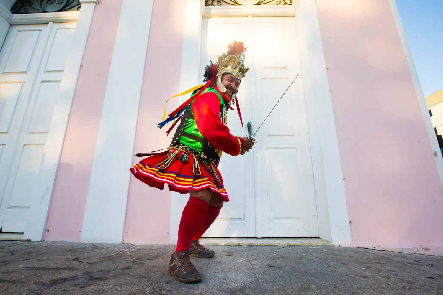 As principais referências da manifestação vêm, segundo o brincante, de Roma e Portugal. “As cores da roupa a gente tirou mais por Portugal. Já as vestes, a gente tem uns coletes e uns saiotes, que é puxado mais pra Roma; e os capacetes também. É coroa, mas a gente chama capacete”, descreve. Quem confecciona essas coroas são Antônio e o irmão Raimundo, os únicos ainda vivos do grupo original.