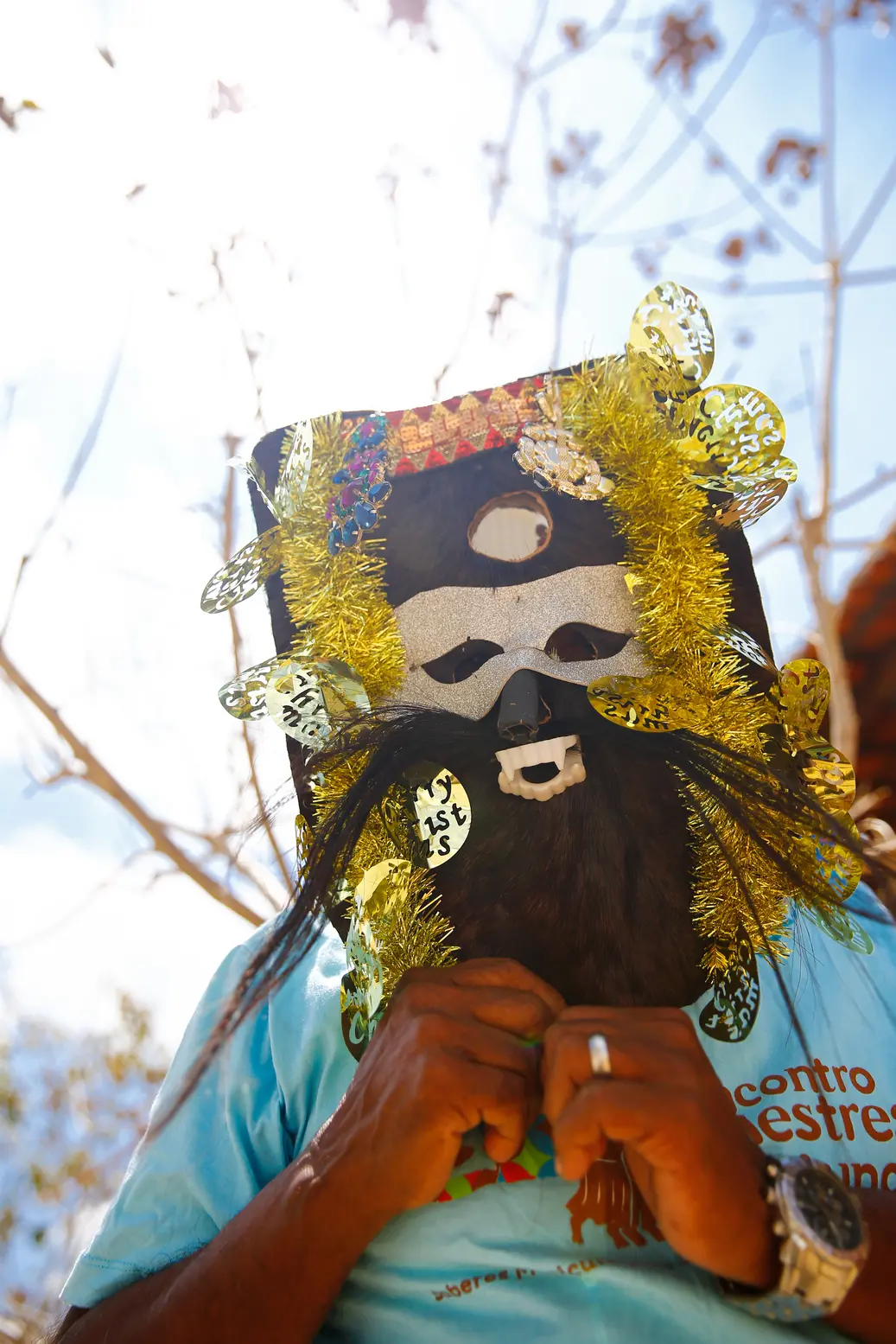 Desde a hora que colocam as máscaras, os mestres viram criança. “Eu mesmo que confeccionei essa minha. É de couro, forrada com pano. E tem esses detalhes para enfeitar”, especifica João André, que coordena o grupo Boi Estrela, de Senador Pompeu.