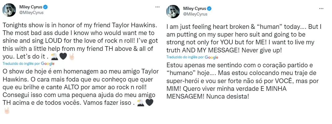 "O show de hoje é em homenagem ao meu amigo Taylor Hawkins. O cara mais f... que eu conheço que gostaria que eu brilhasse e cantasse alto por amor ao rock n roll! Consegui isso com uma pequena ajuda do meu amigo TH. Vamos fazer isso juntos", escreveu Miley na rede social.