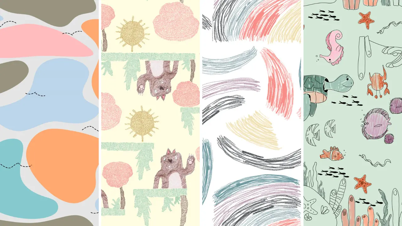 Criando as padronagens, os desenhos foram unidos pelo arquiteto e designer da marca Alexandre Queiroz. Entre elas, há uma com tema de fundo do mar, outra de floresta e outras estampas em formas abstratas coloridas.