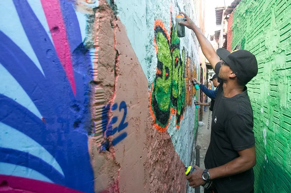 Aproximadamente 200m² de parede ganharam desenhos de três artistas fortalezenses: Doug Graffiti, Douga e Luks. Dez moradores e a equipe de relação do projeto somaram-se a eles para realização de painéis, aplicação de estêncil e oficinas.