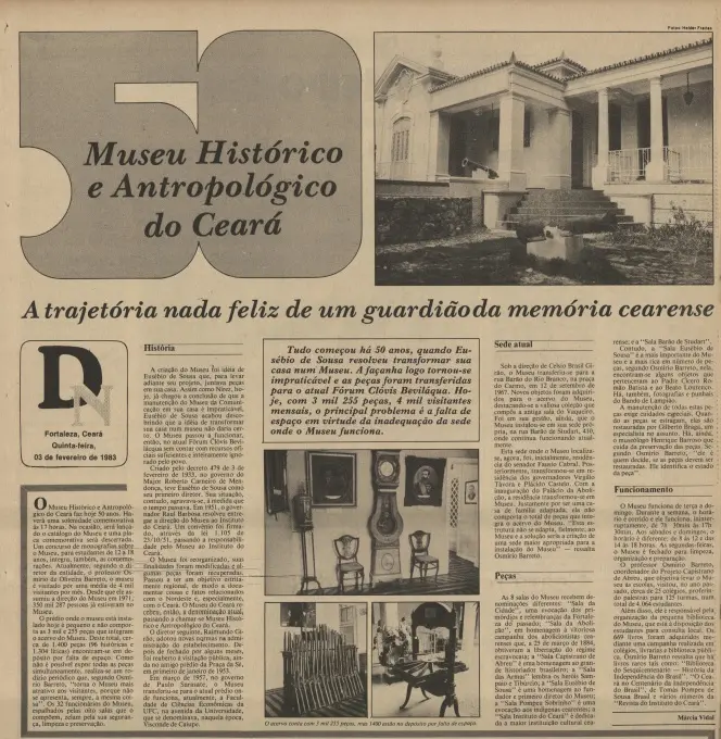 Em 3 de fevereiro de 1983, reportagem do Diário do Nordeste apresentou como título “50 anos do Museu Histórico e Antropológico do Ceará - A trajetória nada feliz de um guardião da memória cearense”. Nela, destacava-se a falta de espaço do equipamento para comportar as mais de três mil peças sob sua posse. A questão se deu em virtude da inadequação da sede onde a casa funcionava – à época, na rua Barão de Studart, 410.