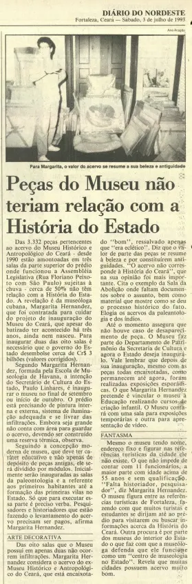 Dez anos depois, em 1993, a matéria “Peças do Museu não teriam relação com o Estado” salienta que o prédio estava precisando de pintura interna e externa, sistema de iluminação adequada e necessitava combater infiltrações. Além disso, embora tendo nome e endereço fixo para figurar nas referências turísticas da cidade, ele não “existia”, conforme o texto.