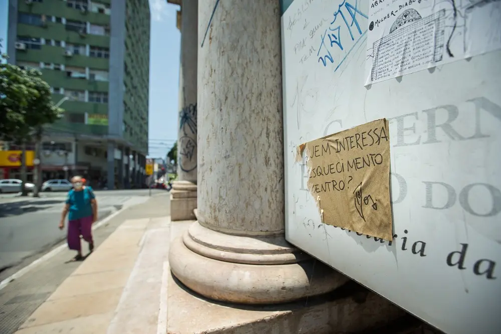 Até lá, o prédio irrompe ao sol, transeuntes continuam passando, e um papel deteriorado colado à parede grita: “A quem interessa o esquecimento do Centro?”.