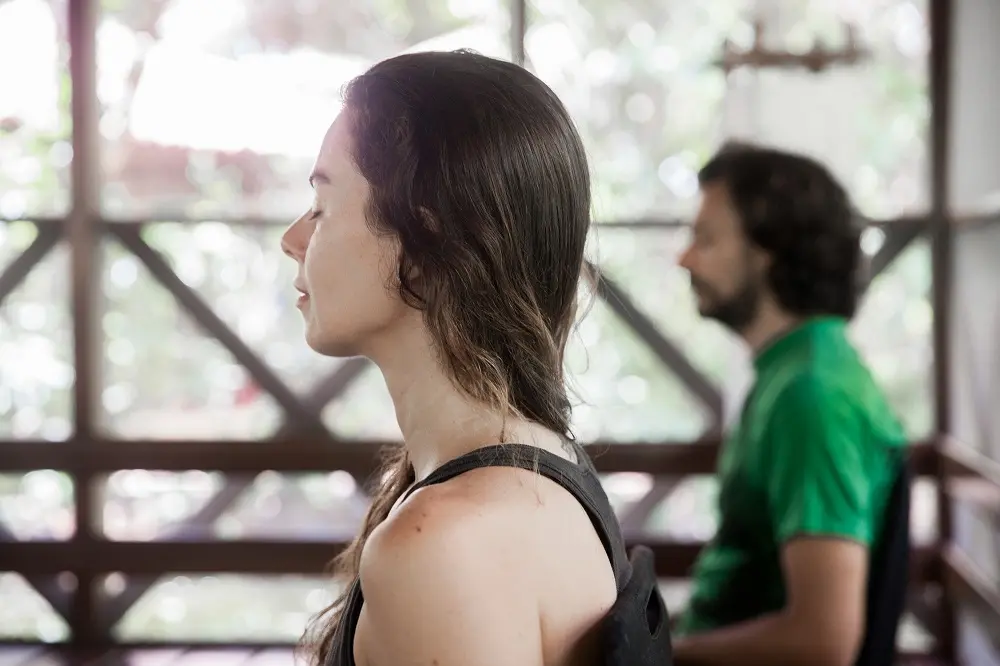 Aos fins das práticas de yoga conduzidas por Raquel Amapos, é costume ter o Shavásana, momento em que os participantes deitam no chão, sentem a respiração e enviam comandos mentais de relaxamento para todo o corpo. A ideia é que, naquele instante, assim como em algumas práticas de meditação, toda a atenção se mova para apenas sentir o corpo se entregar ao chão.