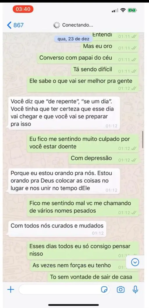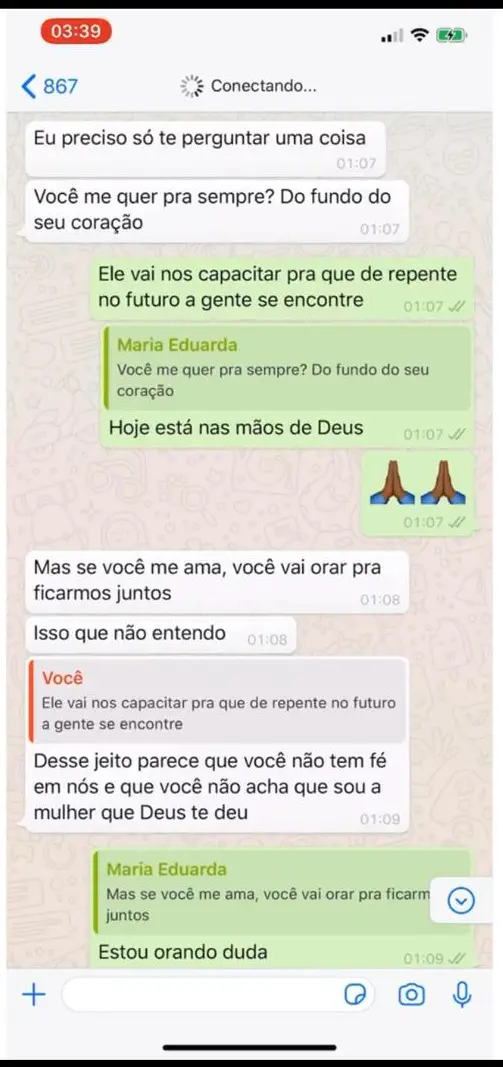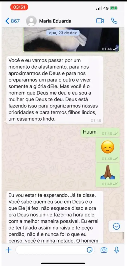 Na sequência, ele rebateu a fala de Duda de que ela teria medo de ir à casa dele. "Mostro a vocês um print que ela fala que retornaria para casa na sexta em vez de sábado. Ela não demonstrou nenhum medo. Depois disso tiveram algumas contribuições que não quero expor e nós chegamos a um acordo para dar ponto final", emendou.