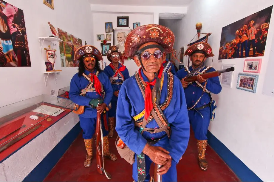 Como para exibir um trunfo, ele logo me conduz até a sala, onde o acervo de fotos, instrumentos, acessórios e documentos se espalhou. Aponta para cada peça com orgulho: "aqui estão as roupas que eu brincava de Mateu; aqui um facão que era minha espada de reisado; essa espingarda foi a primeira do grupo Bacamarteiros da Paz", introduz.