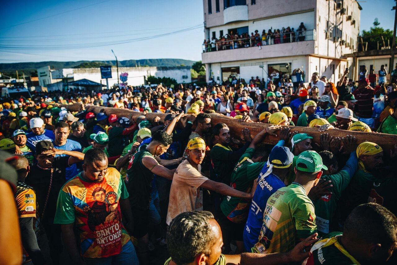 Por volta do meio-dia, os mais de 300 homens de todas as idades começando o revezamento no carregamento do tronco, entre palavras de comando e goles de cachaça para aguentar a árdua tarefa. Não há preparo físico, lembra Maguila: é tudo na fé. E na confiança entre os “irmãos” de penitência.