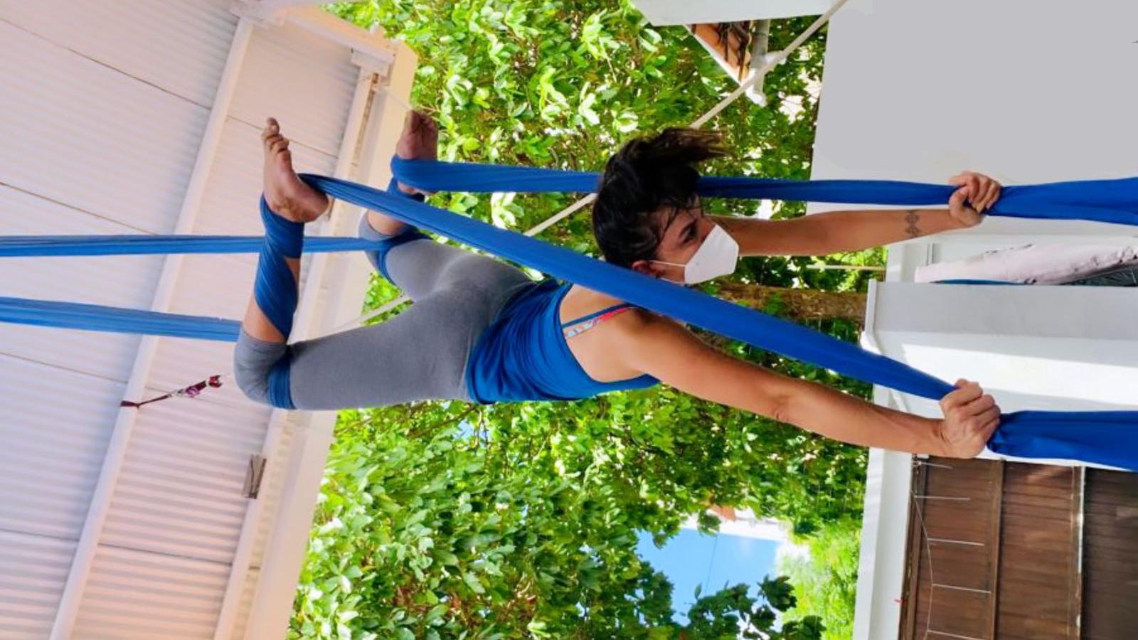 Ela, que também é psicóloga e psicanalista, iniciou o exercício em tecidos acrobáticos em novembro, como complemento à prática de musculação que lhe é necessária.
