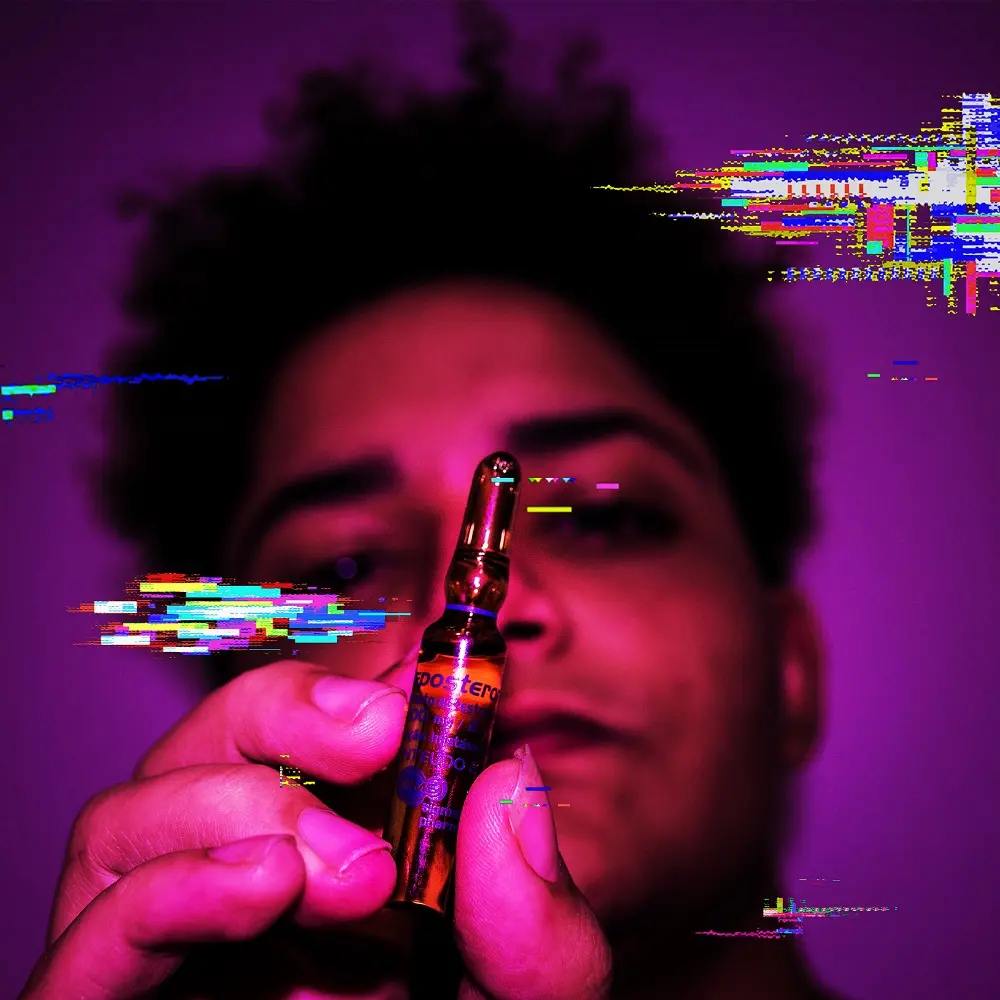 Cyborgue é parte de um auto-estudo das possibilidades do corpo e da relação implícita entre os processos de construção de gênero e a montagem de um ser envolvido na relação entre fármaco, acessórios, próteses e maquinários. A oleosidade dos hormônios se confunde com os fluidos que giram engrenagens e, na possibilidade de si, o eu emerge da transgressão das ferramentas de conformidade (hormônio, roupa, etc). Cyborgue é um processo visual das experimentações vivas e dos corpos projetados. Tríptico fotográfico com edição digital. Manuseio de agulhas, ampolas, hormônios e sangue.