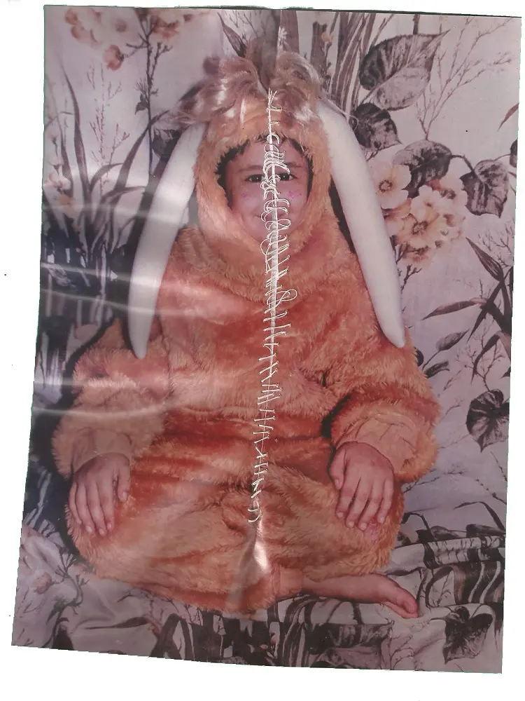 Impressão em papel fotográfico com costura, 2022. A obra começa no Seminário Imaginação e Memória na Arte Contemporânea, feito em parceria com o MAC a partir da interlocução das pesquisadoras Rodrigo Lopes e Lucas de Lacerda. Durante o seminário, a partir de uma provocação, revisitei fotos da minha infância. Minha mãe me contou na época que comecei a entender a minha sexualidade que havia rasgado fotos que eu tinha uma performatividade feminina. Nesse trabalho, escolho fotos que ainda consigo ver essa performatividade. A partir disso, realizo uma investigação com quatro fotos de infância. Para a exposição, a obra se dá por meio de uma impressão da imagem e costura à mão do rasgo que realizo nela.