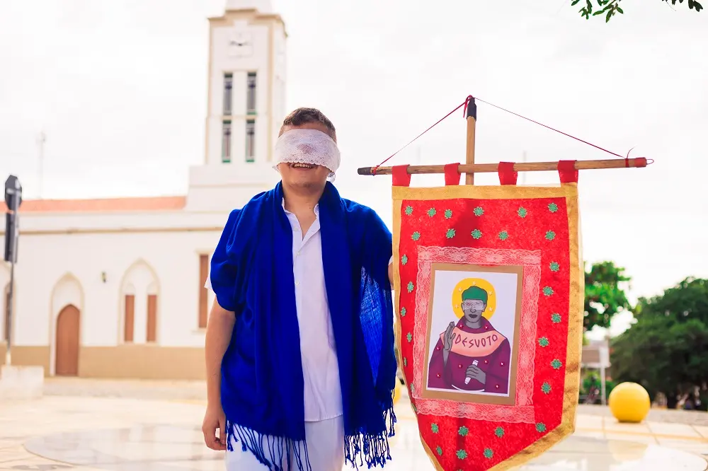 Trabalho que apresenta o resultado de um processo criativo desenvolvido na residência em performance do Porto Dragão (2021). No estandarte, é apresentado o santo das graças não-atendidas criado pelo artista, e orações são distribuídas aos moradores de uma rua da cidade de Nova Olinda-CE. Nesta criação, Filipe Alves segue em procissão pelas causas não-escutadas, representadas pelos Des-votos – reivindicação dos pedidos não-realizados, o contrário do Ex-voto, que traz um agradecimento ou pedido para a graça alcançada.