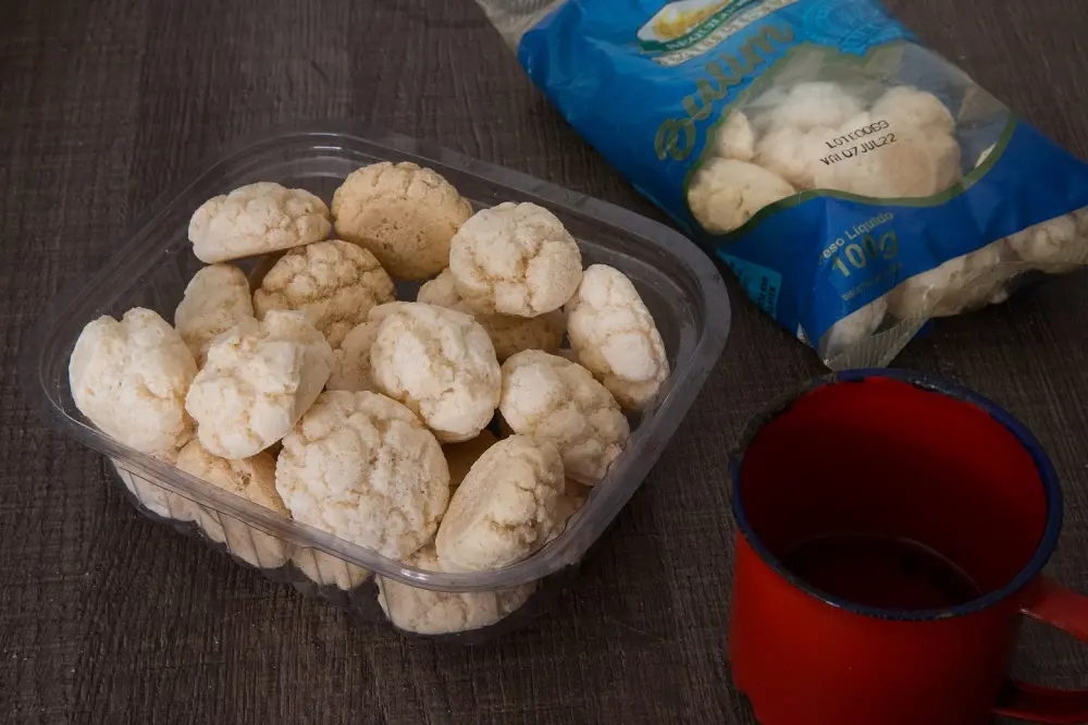A linha de produção do alimento na fábrica de Júnior, de menor porte, envolve apenas duas pessoas. A iguaria é feita com açúcar, coco, goma e ovo. Passa pela preparação da massa, o molde em uma bandeja e depois a chegada ao forno. A média é de 30 sacas por dia.
