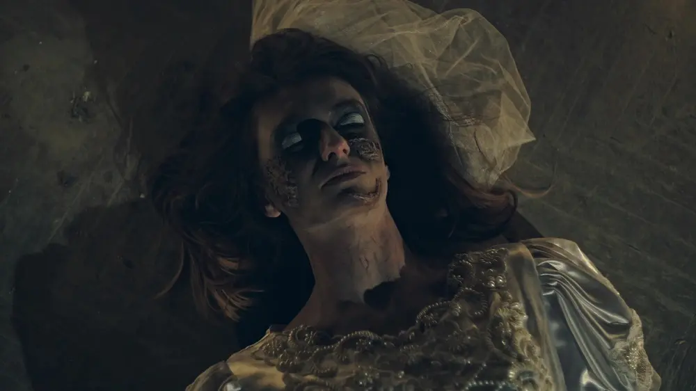 Corta para o interior de um galpão. Nele, encostada em dois pilares improvisados de pedra, ela descansava. A Noiva. Goteiras caíam do teto. O ar estava carregado de terra, bem como de um perfume doce – um incenso queimava perto da Noiva. Ela se espalhava. Por todo lugar. A Noiva habitava as pupilas dos garotos que ali estavam. As palavras e silêncios deles.
