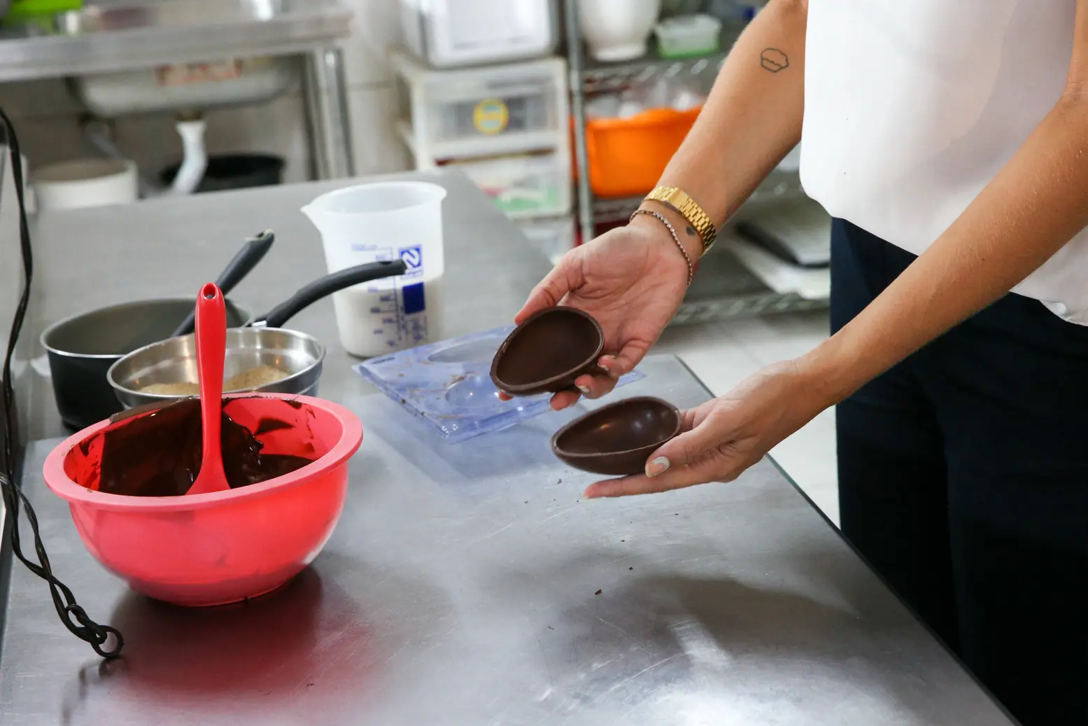 Os ovos veganos de Kelry, proprietária da da Ma Douce, são feitos com a casca de chocolate belga 54% cacau, que não possui leite animal em sua composição, e o recheio de brigadeiro vegano. Esse brigadeiro é feito à base de leite de castanha, leite de coco e chocolate belga 70%.