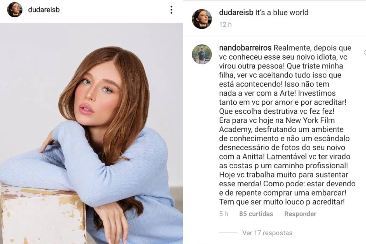Luiz deixou um comentário em uma foto de Duda, onde afirma que ela está sustentando o noivo, enquanto ele, endividado, comprou até um barco. O pai salientou ainda que o relacionamento está destruindo a carreira de atriz da filha.