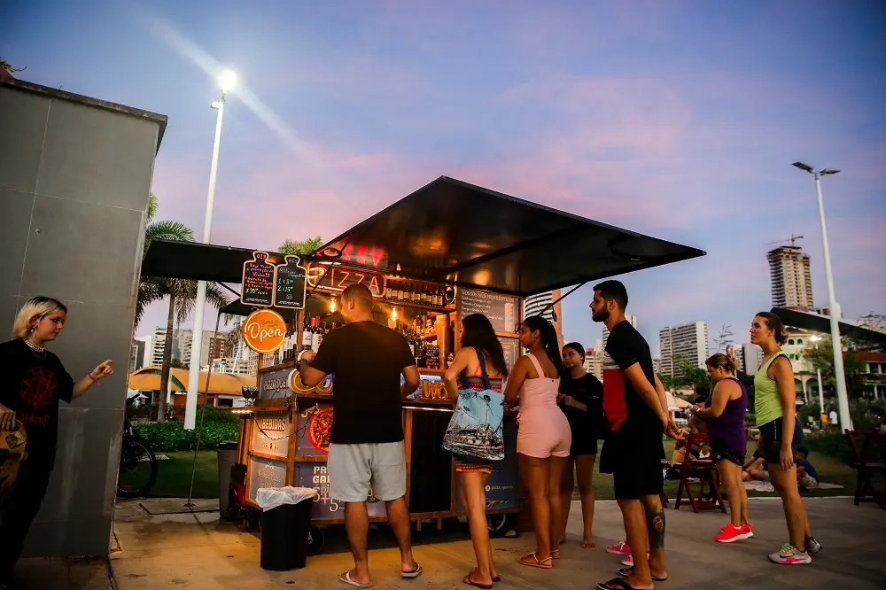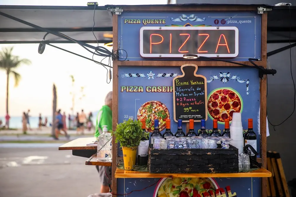 Fim de tarde na Beira-Mar de Fortaleza. Caminhada, banho de mar e pedal. Entre um divertimento e outro, que tal uma pizza no gramado com vinho e alfajor? É a experiência proposta pela Pizza Quente dos Argentinos. O carrinho em tons de azul e neon faz sucesso na cidade.