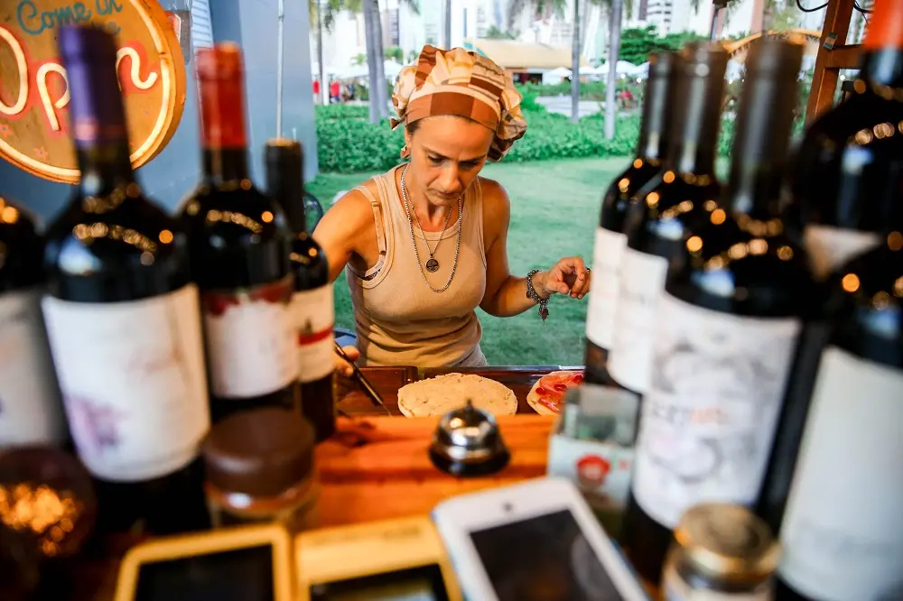 São vários os destaques. A própria estrutura do empreendimento encanta. Sortida e ao lado da Feirinha da Beira-Mar, reúne vinhos, cartelas para pedidos, alfajores e decoração alinhada aos vizinhos hermanos. Atrás do balcão, Felix e Cecilia se revezam para produzir as pizzas. A massa, feita por eles, chega pré-pronta e é cozinhada na hora, garantindo sabor e calor.