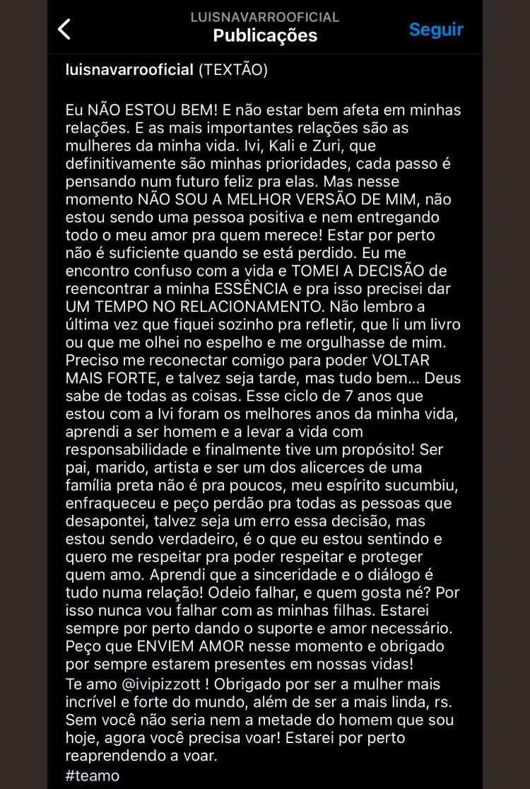 O anúncio do término do casamento do ator Luis Navarro, de “Todas as Flores”, com a atriz e bailarina Ivi Pizzott repercutiu na web após ele declarar que estava confuso com a vida. “Não lembro a última vez que fiquei sozinho pra refletir, que li um livro ou que me olhei no espelho e me orgulhasse de mim. Preciso me reconectar comigo para poder voltar mais forte”, disse em um post.