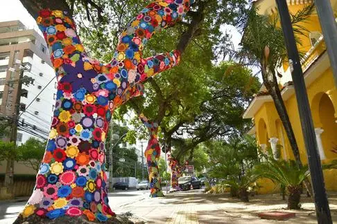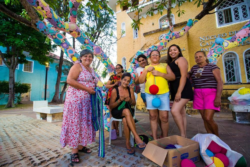 Quem passa agora pela Praça Luíza Távora, no bairro Aldeota, se depara com árvores revestidas com crochê, ora brancas ora coloridas. O trabalho, realizado por quatro associações de artesãs cearenses, compõe a decoração natalina do local, com referências ao litoral e ao sertão.