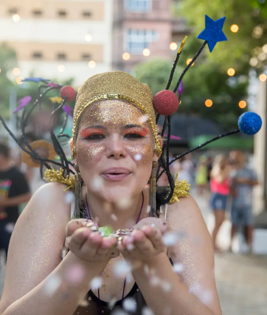 Claro que na festa mais foliã de todas a fantasia, as maquiagens coloridas e o glitter não podem faltar. É tempo de ousar e deixar a imaginação rolar solta. Seja apenas com adereços de cabeça ou roupas customizadas, é possível chamar a atenção com o look escolhido.