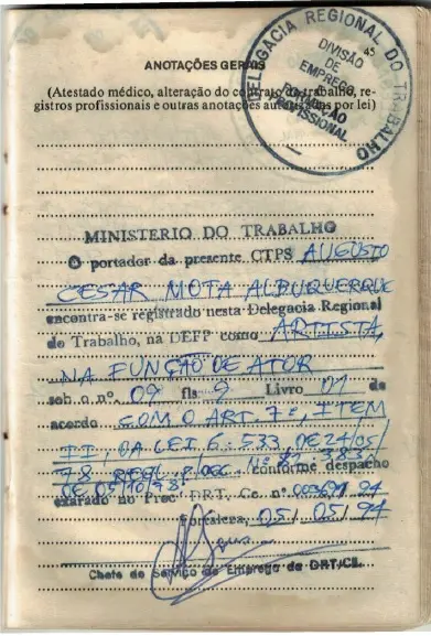 Quatro de maio de 1994 é data importante para as Artes Cênicas do Ceará. Foi quando o primeiro ator conseguiu ser registrado profissionalmente por meio da Delegacia Regional do Trabalho (DRT/CE). A conquista, a princípio apenas pessoal, redesenhou a rota do segmento no Estado e oportunizou que mais horizontes fossem abertos no front.