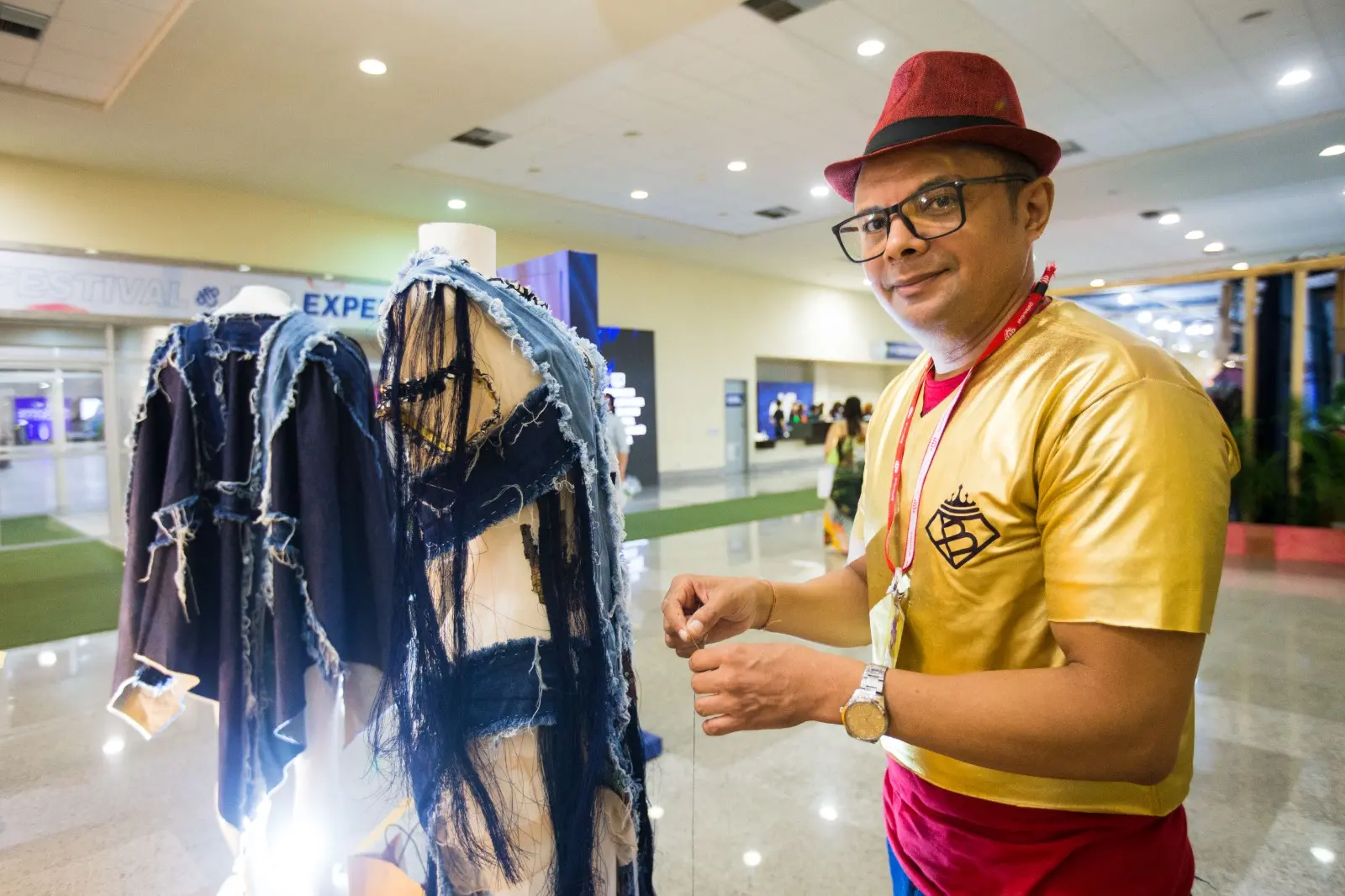 O designer Marcelo Belisário apresenta, em uma exposição, peças suas produzidas a partir da técnica do upcycling, que consiste no reaproveitamento têxtil transformando em peças únicas e autorais.