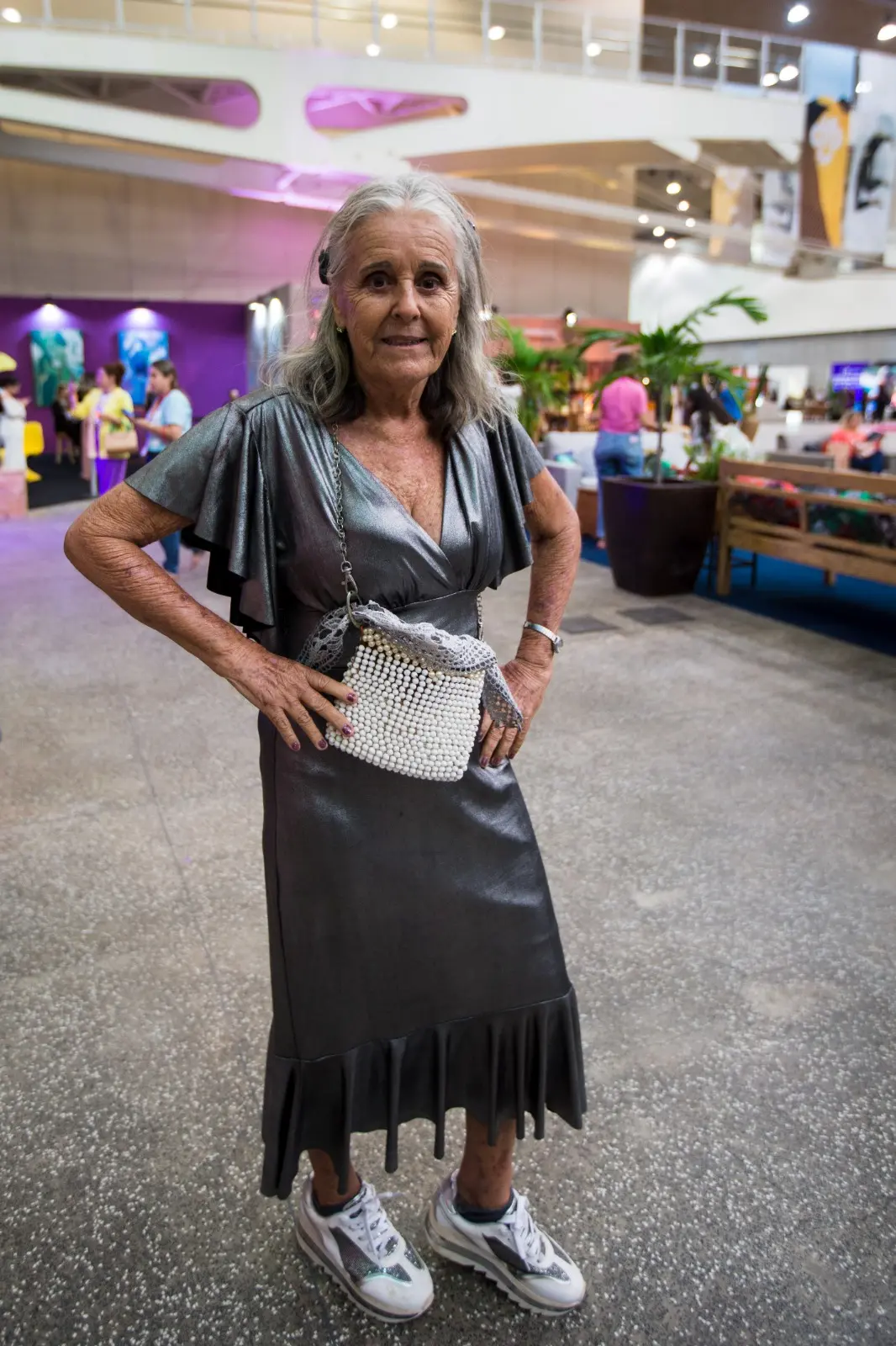 A aposentada Jandira Damasceno, de 74 anos, produziu as próprias roupas e bolsas para o evento. O look escolhido do primeiro dia foi um vestido metalizado prata com babados discretos e decote em V. Para compor, ela usou um tênis branco com detalhes prateados.