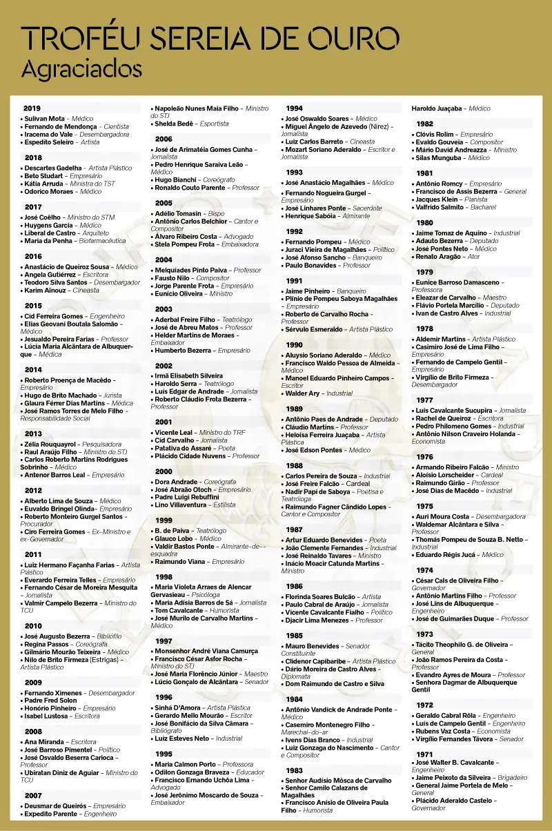 Na história do Troféu Sereia de Ouro, as personalidades homenageadas desfilaram aos olhos da sociedade atestando essa indiscutível premissa. Presentes em diferentes segmentos profissionais, à frente de inovadores projetos e iniciativas, consolidam-se como modelo de esforço e talento além-fronteiras.