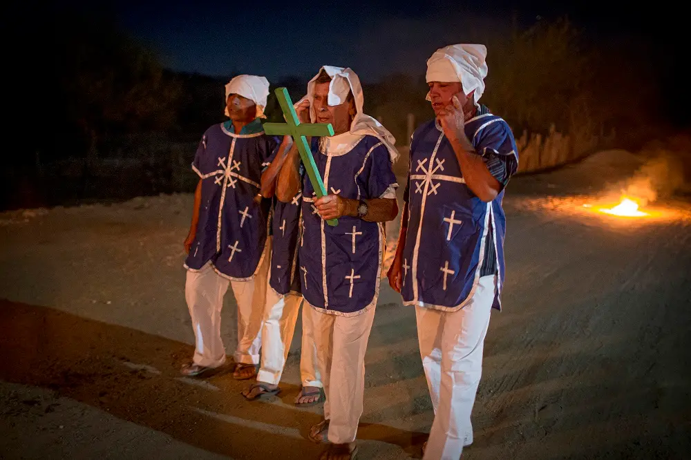 Não é exagero. Sobretudo nos 40 dias que antecedem a Páscoa, a jornada do homem é rezar terço, tirar esmola, fazer jejum. Um rigor cujo ponto alto é relembrar o sofrimento de Cristo ao viver, literalmente na pele, dor semelhante ao do Deus homem. Mestre Deca usa tranças de couro com cachos de lâmina para flagelar as costas até escorrer sangue.