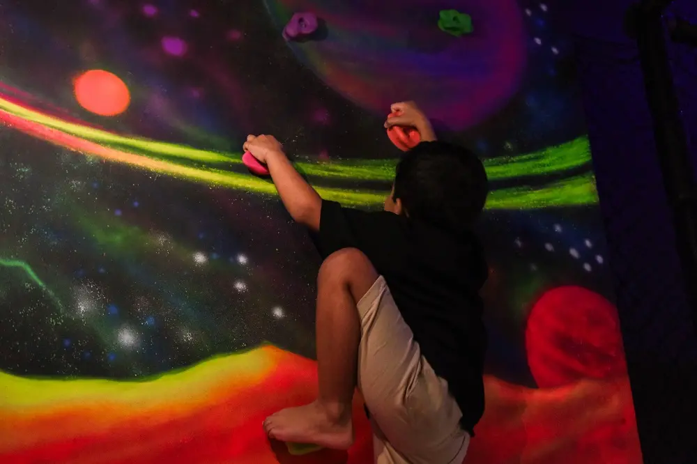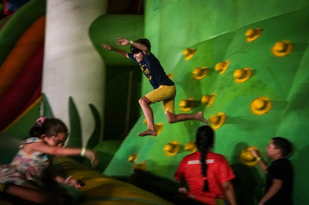 Além disso, slackline – também profissional –, parede de escalada e brincadeiras, a exemplo de gira kids, batalha de cotonetes e piscina de bolinhas no trampolim, completam a alegria. Enquanto pulamos, sempre auxiliados por monitores, projeções mergulham a visão em planetas, estrelas e galáxias. O imenso do planeta fica bem próximo, e fascina.